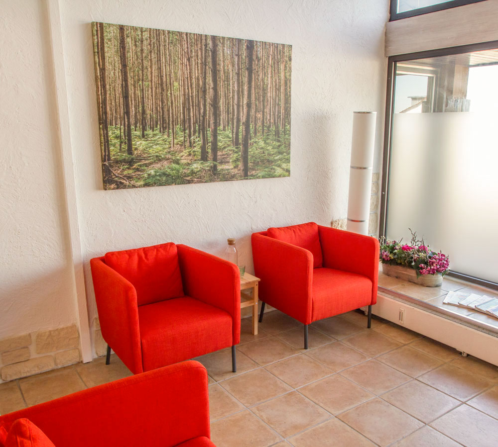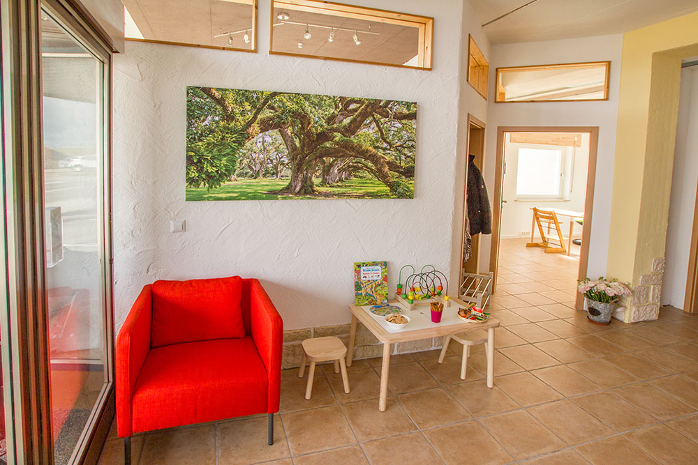 Der Eingang ist über eine mobile Rampe auch für Rollstuhlfahrer geeignet. Bitte geben Sie uns bei der Anmeldung Bescheid, damit wir die Rampe für